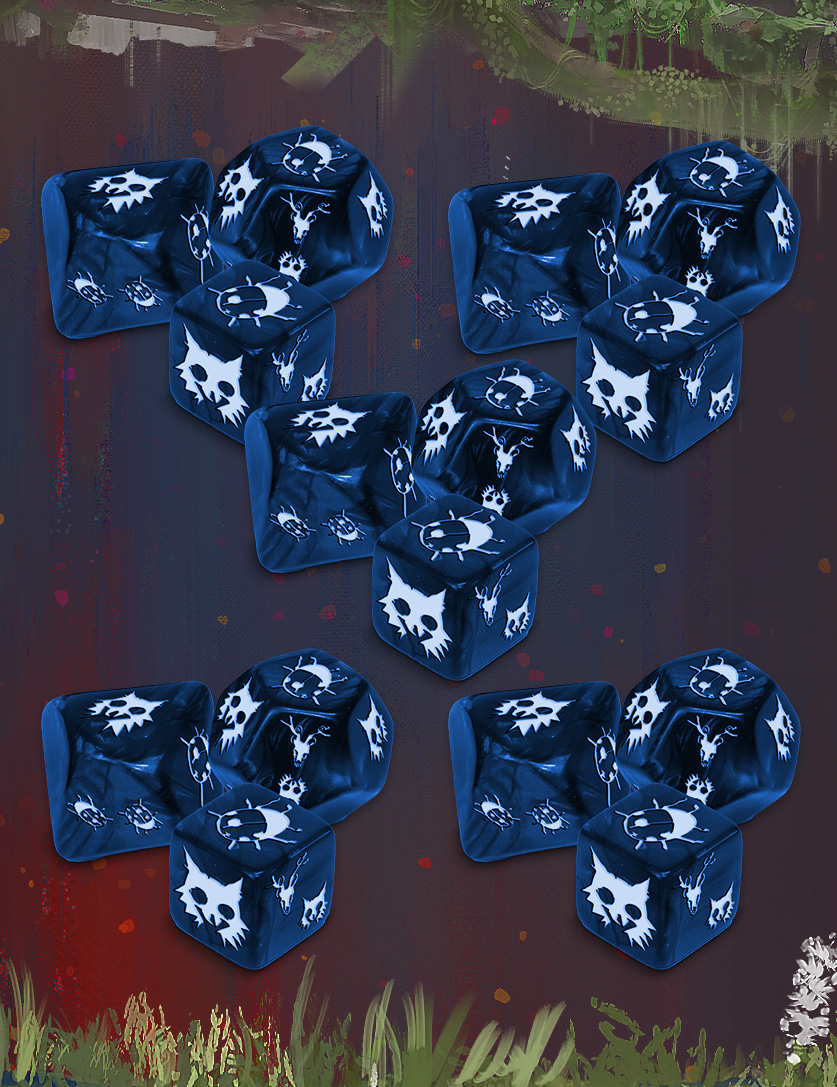 Feitos em resina opaca, os dados de Assimilação trazem símbolos únicos que representam forças vitais do jogo: